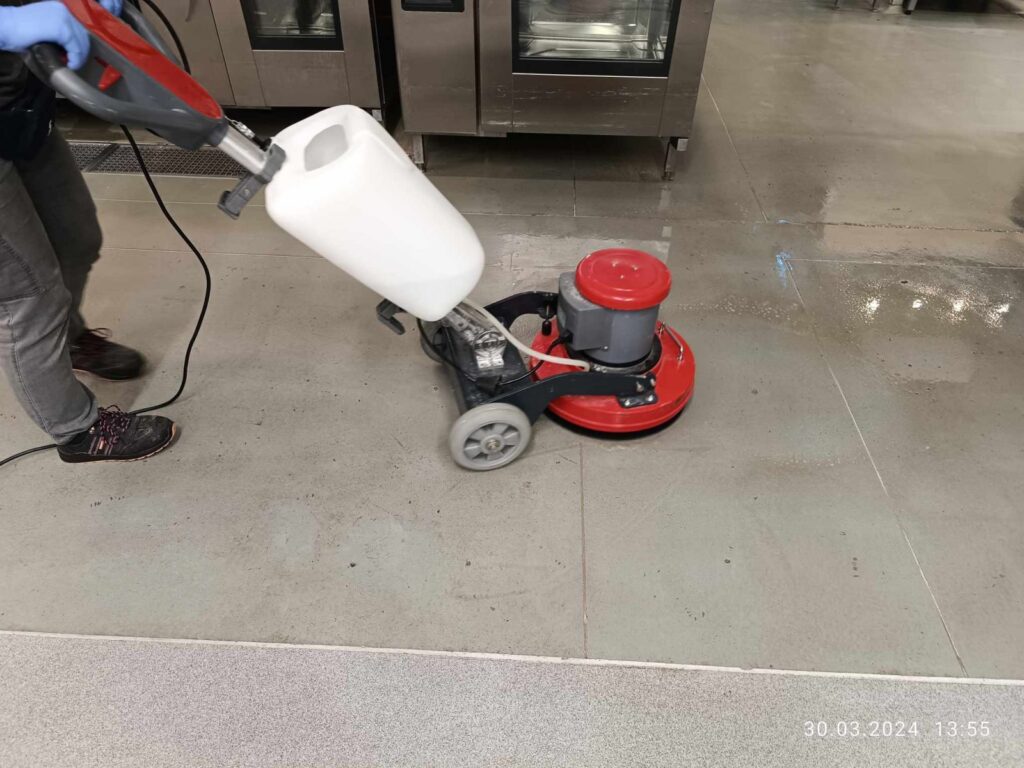 Podczas użytkowania pomieszczenia posadzki ulegają zabrudzeniu w wyniku oddziaływania takich czynników, jak smary, płyny eksploatacyjne maszyn, oleje, kleje, środki chemiczne, czy też brud nanoszony przez obuwie. Przy sprzątaniu obiektów wielkopowierzchniowych wyróżnia się sprzątanie bieżące oraz doczyszczanie. Podczas sprzątania bieżącego używa się środków chemicznych o mniejszych stężeniach roztworów roboczych, bezpiecznych dla każdego rodzaju powierzchni. Sprzątanie bieżące możne się odbywać nawet kilka razy w ciągu dnia. Co z kolei może powodować, że z czasem na posadzce zacznie odkładać się detergent. Wówczas należy przeprowadzić proces doczyszczania posadzek. Ma on na celu usunięcie uporczywych zabrudzeń i nagromadzonego detergentu.